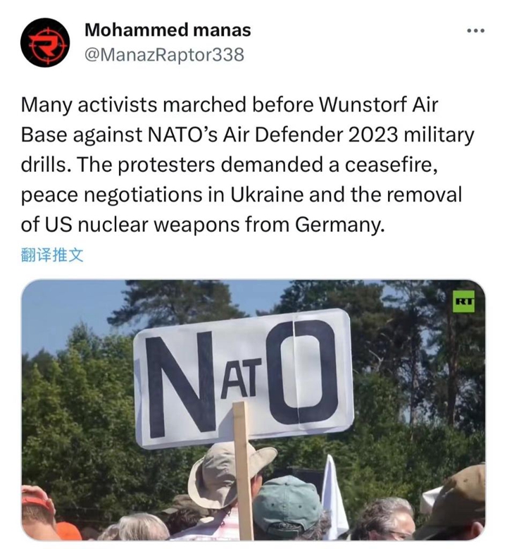 北約正在德國等地舉行成立以來規(guī)模最大的空中軍事演習(xí),為期長達(dá)11天,25個國家約1萬名軍人和250架各型軍機(jī)參加。接連三天,德國多地舉行抗議活動,批評以美國為首的北約通過輸出軍援、大規(guī)模軍演來持續(xù)“拱火”俄烏沖突。