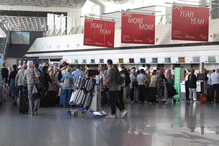 6月12日,在德國法蘭克福機(jī)場,旅客辦理乘機(jī)手續(xù)。新華社記者 單瑋怡 攝