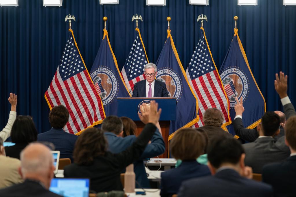 6月14日,美國聯(lián)邦儲備委員會主席鮑威爾(后)在華盛頓出席記者會。美國聯(lián)邦儲備委員會14日結(jié)束為期兩天的貨幣政策會議,宣布維持5%至5.25%的聯(lián)邦基金利率目標區(qū)間不變。(新華社記者劉杰攝)