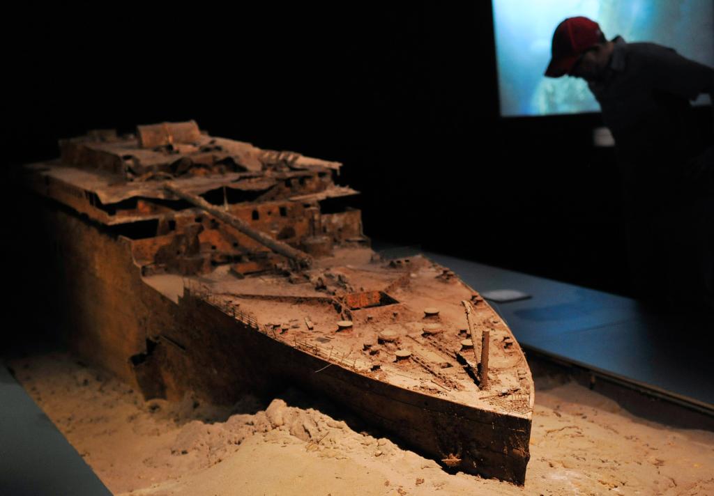 2012年4月5日,在美國(guó)首都華盛頓國(guó)家地理博物館舉行的“泰坦尼克”號(hào)沉船百年展上,人們觀看沉船殘骸模型。新華社記者王軼歐攝