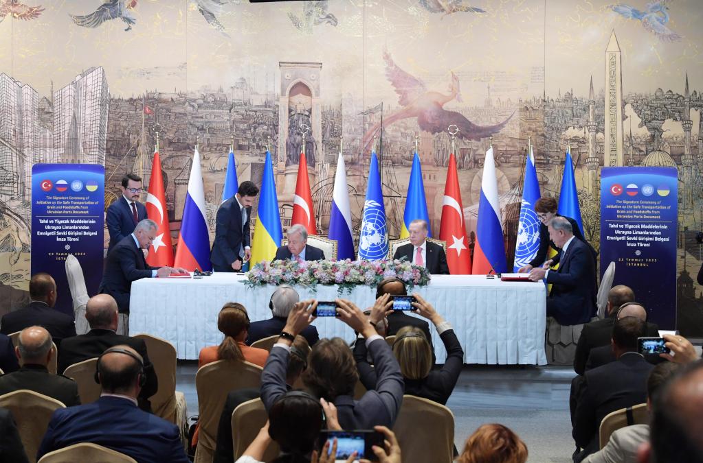 2022年7月22日,在土耳其伊斯坦布爾多爾瑪巴赫切宮,土耳其國(guó)防部長(zhǎng)阿卡爾(右)、聯(lián)合國(guó)秘書長(zhǎng)古特雷斯(中左)與俄羅斯國(guó)防部長(zhǎng)紹伊古(左)在簽署協(xié)議。當(dāng)日,土耳其、俄羅斯、烏克蘭和聯(lián)合國(guó)代表在土耳其最大城市伊斯坦布爾就從黑海港口外運(yùn)農(nóng)產(chǎn)品問(wèn)題舉行簽署協(xié)議儀式。新華社記者 沙達(dá)提 攝