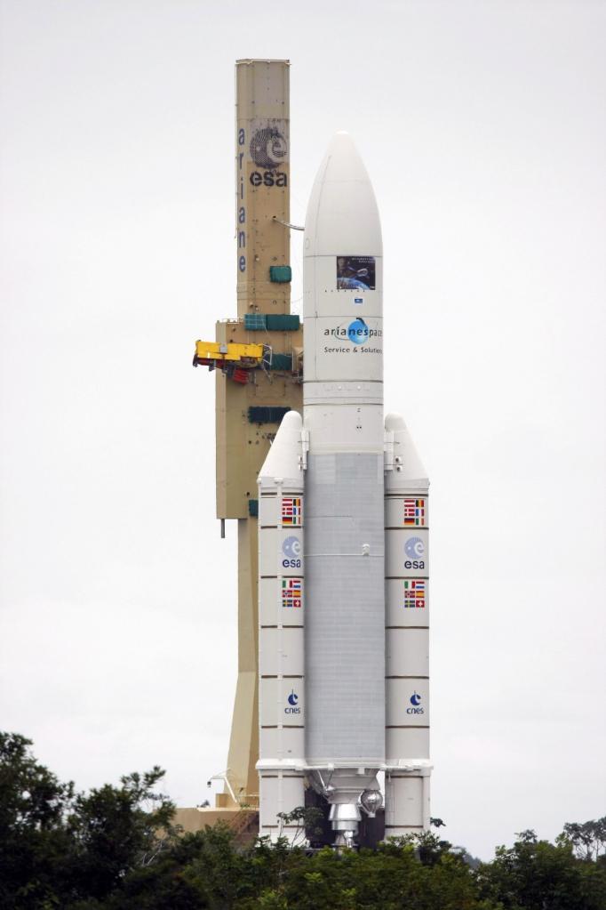 2008年3月7日,歐洲航天局研制的首艘自動貨運(yùn)飛船準(zhǔn)備搭乘“阿麗亞娜-5ES”型火箭從法屬圭亞那庫魯航天中心升空。新華社發(fā)