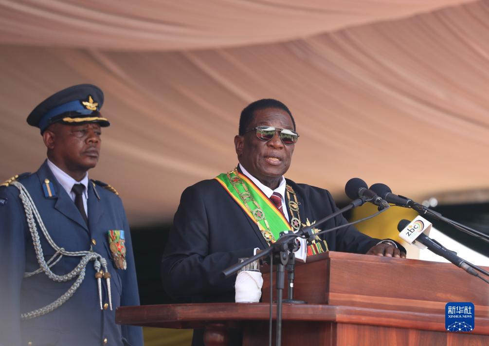 9月4日,在津巴布韋首都哈拉雷的國家體育場,津巴布韋當(dāng)選總統(tǒng)姆南加古瓦(右)在就職典禮上致辭。新華社發(fā)(肖恩·朱薩攝)