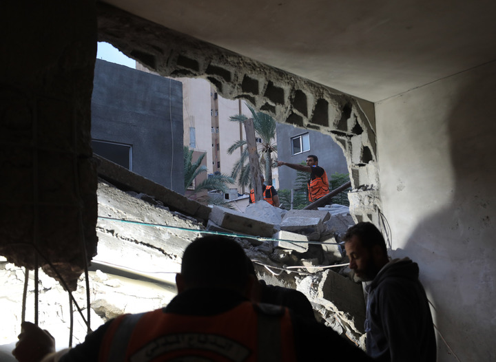 10月22日,在加沙城,人們?cè)谠庖陨幸u擊損毀的建筑中實(shí)施救援。新華社發(fā)(亞西爾·庫迪攝)