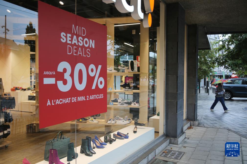 10月31日,一名女子從比利時(shí)布魯塞爾一家貼有打折信息的店鋪旁走過。新華社記者 趙丁喆 攝