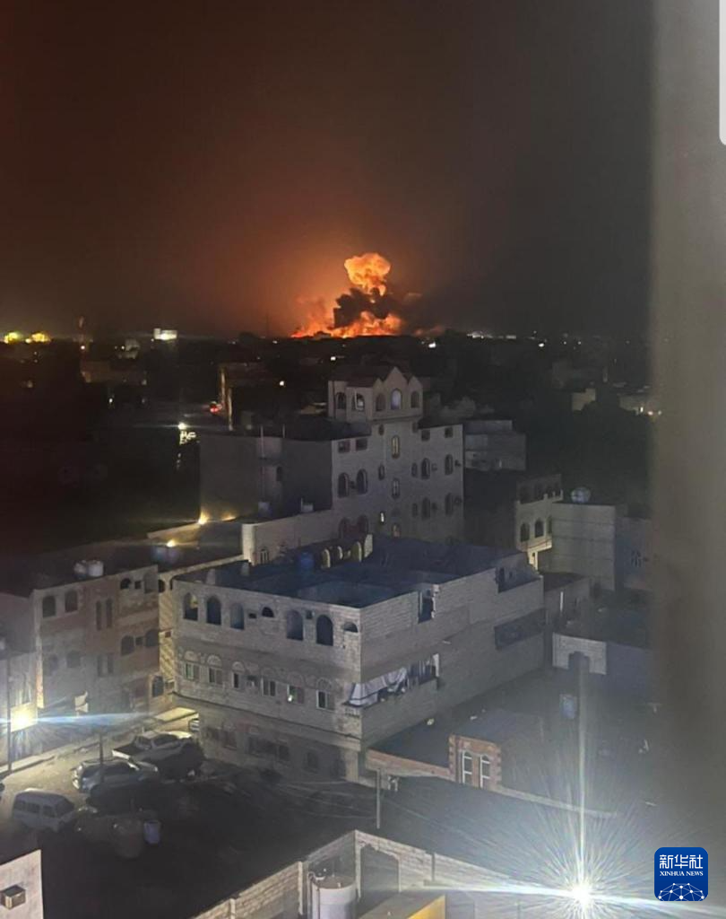 ??這是1月12日在也門首都薩那拍攝的空襲后的爆炸畫面(手機(jī)照片)。據(jù)也門薩巴通訊社12日報道,美國和英國的戰(zhàn)機(jī)在當(dāng)?shù)貢r間12日凌晨空襲了也門首都薩那、西部紅海城市荷臺達(dá)和北部薩達(dá)省內(nèi)的多處目標(biāo)。新華社發(fā)