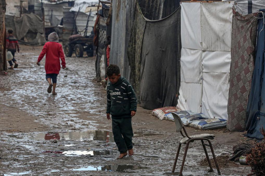 11月26日,在加沙地帶中部代爾拜拉赫,一名男孩光腳行走在泥濘的帳篷外。新華社發(fā)(里澤克·阿卜杜勒賈瓦德攝)