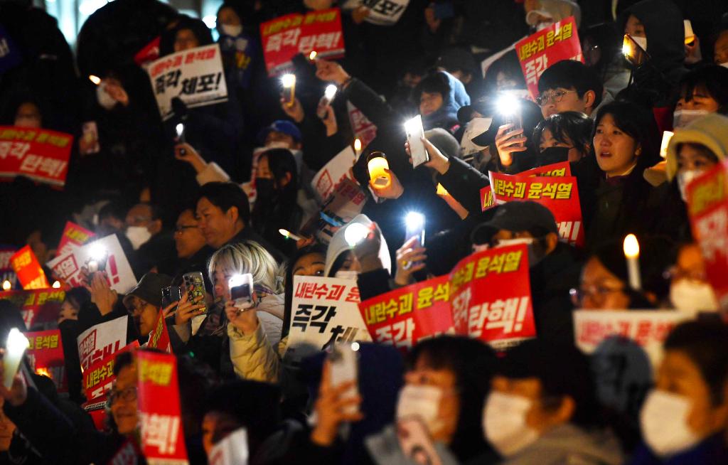 12月4日,人們?cè)陧n國(guó)首爾舉行集會(huì),要求總統(tǒng)尹錫悅下臺(tái)。新華社發(fā)(全休相攝)