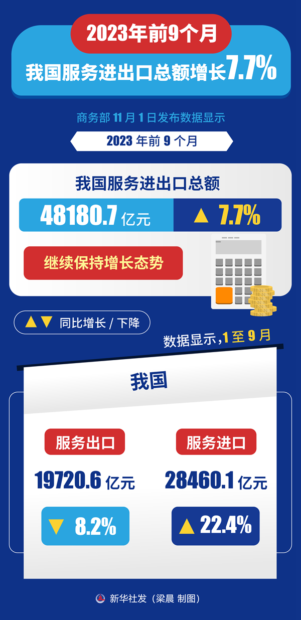 新華社北京11月1日電 商務(wù)部1日發(fā)布數(shù)據(jù)顯示,今年前9個(gè)月,我國(guó)服務(wù)進(jìn)出口總額48180.7億元,同比增長(zhǎng)7.7%,繼續(xù)保持增長(zhǎng)態(tài)勢(shì)。