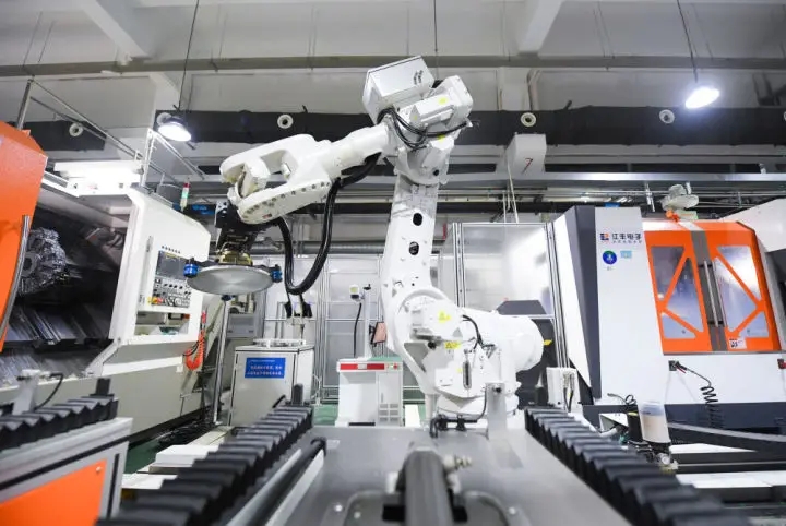 在浙江寧波江豐電子材料股份有限公司分析檢測(cè)中心,工業(yè)機(jī)器人在自動(dòng)化產(chǎn)線加工芯片靶材(2023年3月21日攝)。新華社記者 翁忻旸 攝