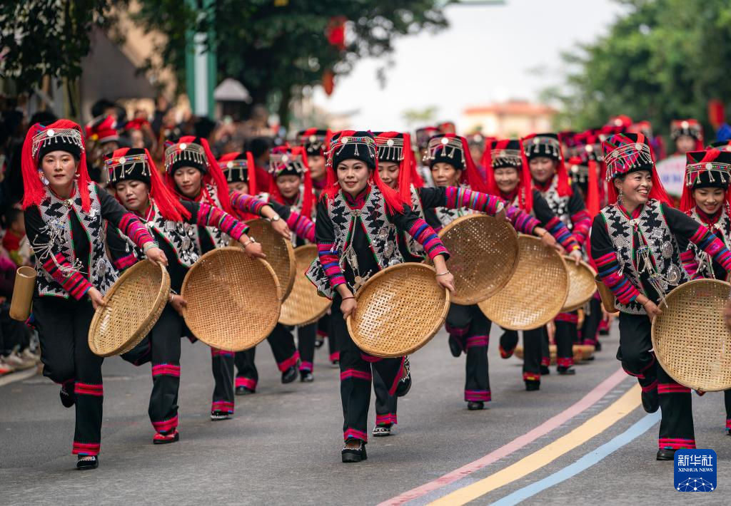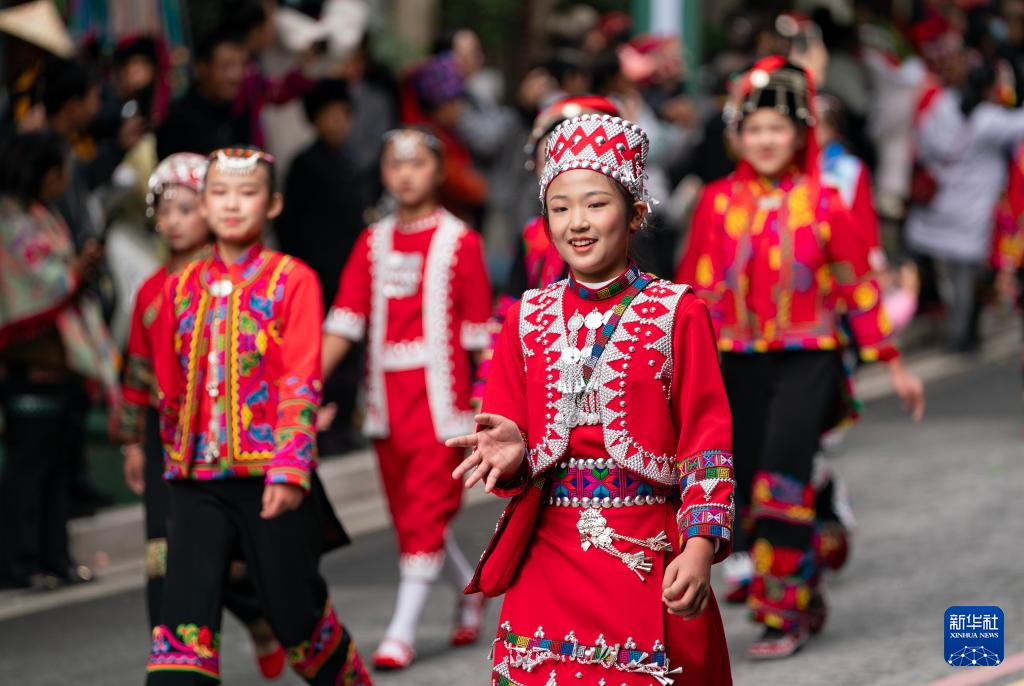 11月19日,綠春縣哈尼族群眾參加哈尼長(zhǎng)街古宴巡游展演。