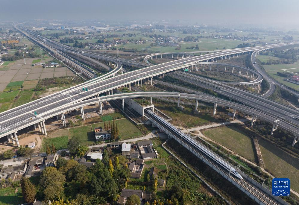11月28日,首發(fā)列車(chē)C6008次列車(chē)行駛在川青鐵路上,該段與成萬(wàn)高速并行、與成都都市圈環(huán)線(xiàn)高速交會(huì)(無(wú)人機(jī)照片)。新華社記者 江宏景 攝