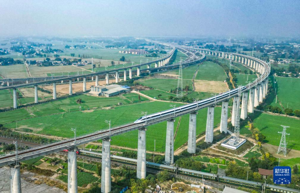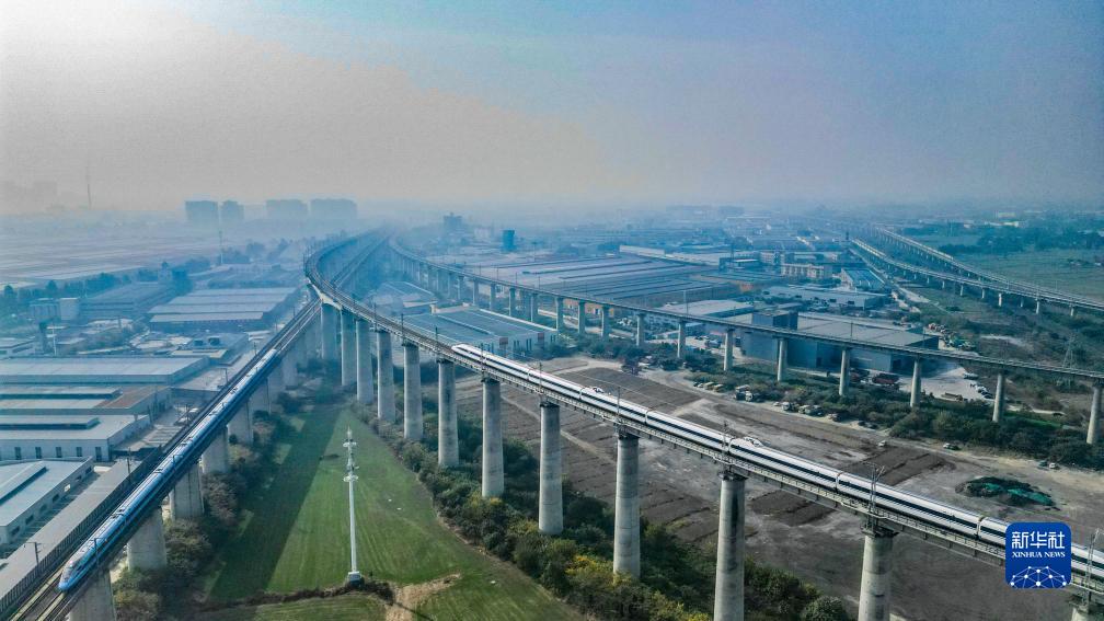 11月28日,在成都市青白江區(qū)境內(nèi)拍攝的行駛在川青鐵路上的列車(chē)(上)和行駛在西成高鐵線(xiàn)上的列車(chē)(下)(無(wú)人機(jī)照片)。新華社記者 王曦 攝