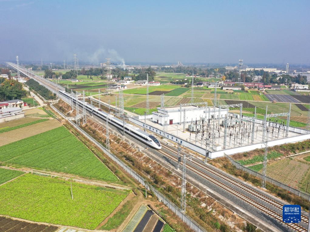 列車(chē)?吭诖ㄇ噼F路鎮(zhèn)江關(guān)站,該站毗鄰岷江,站臺(tái)跨越317國(guó)道(11月13日攝,無(wú)人機(jī)照片)。新華社記者 江宏景 攝