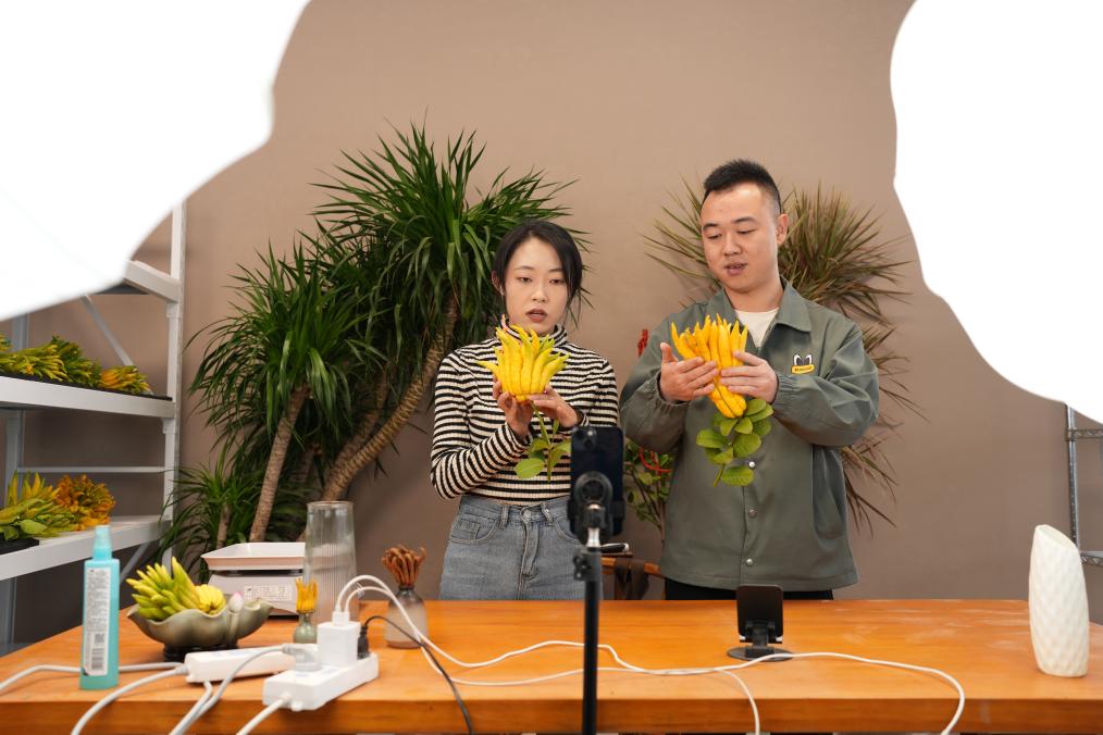 11月13日,在金華市婺城區(qū)羅店鎮(zhèn)金佛手果園共富工坊,工作人員在直播推銷佛手。新華社記者 翁忻旸 攝