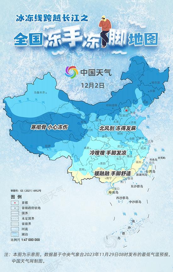 時值11月末,又到了“凍手凍腳”的時節(jié)了,網(wǎng)友紛紛調(diào)侃:“手腳外露一分鐘,化凍需要一小時!弊蛱欤11月29日),一股較強冷空氣再次“發(fā)貨”,今明天中東部多地氣溫將再刷新今年下半年新低,東北、內(nèi)蒙古等部分地區(qū)最低溫可跌至-15℃以下,冰凍線或抵達江南北部。中國天氣網(wǎng)推出全國凍手凍腳地圖,看哪里將體驗寒徹骨,要防凍傷。