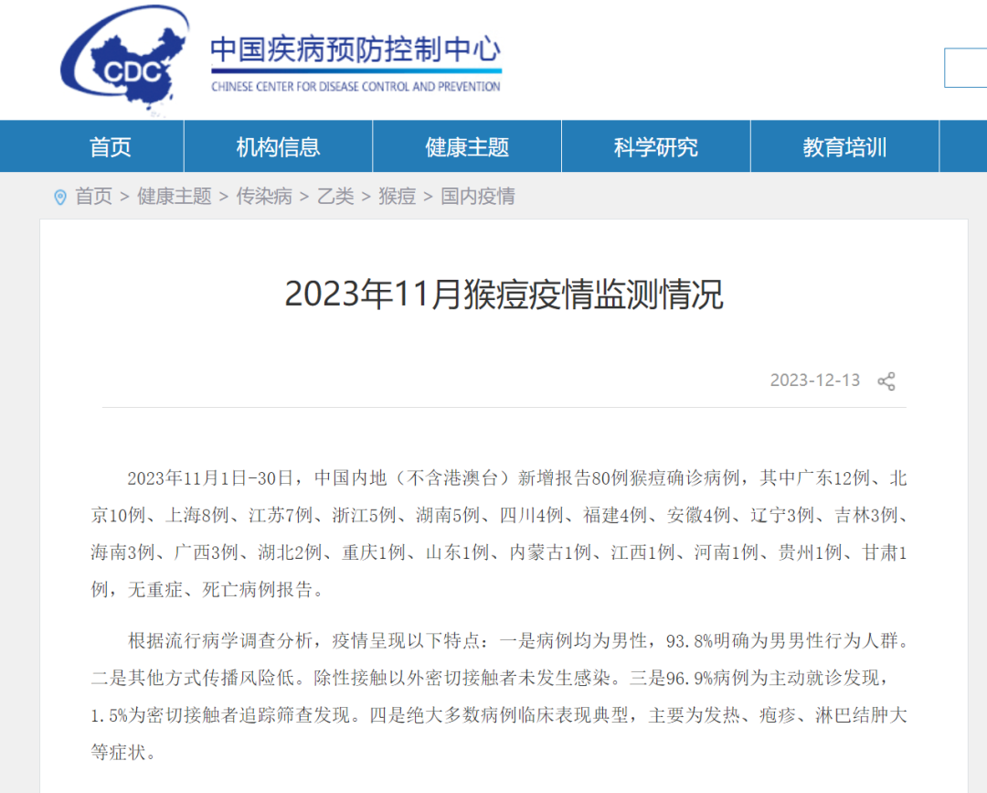 12月13日,中疾控官網(wǎng)通報,2023年11月1日-30日,中國內(nèi)地(不含港澳臺)新增報告80例猴痘確診病例,其中廣東12例、北京10例、上海8例、江蘇7例、浙江5例、湖南5例、四川4例、福建4例、安徽4例、遼寧3例、吉林3例、海南3例、廣西3例、湖北2例、重慶1例、山東1例、內(nèi)蒙古1例、江西1例、河南1例、貴州1例、甘肅1例,無重癥、死亡病例報告。