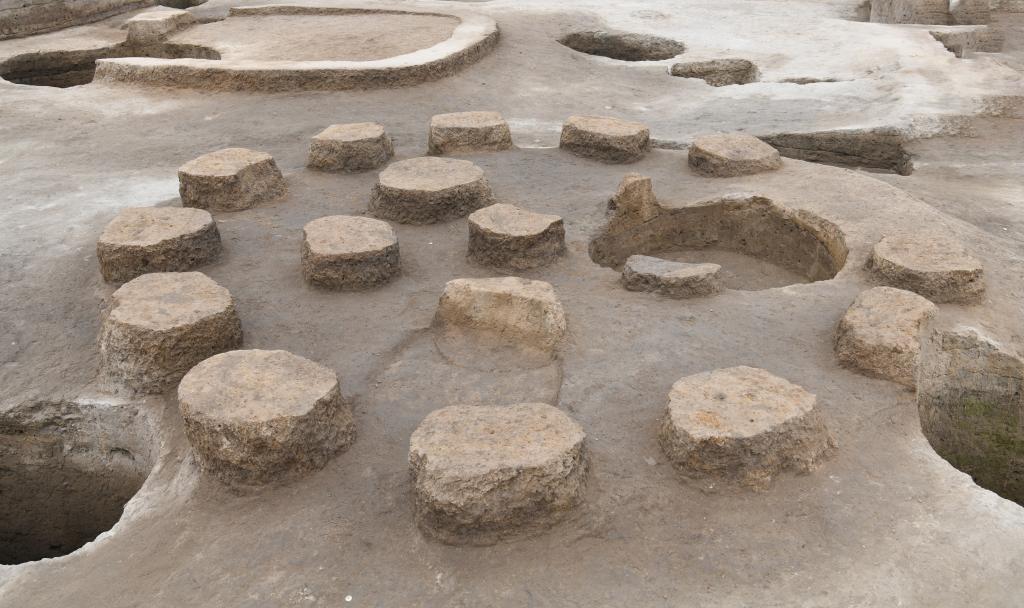 “其中標(biāo)號(hào)為F9、F14的兩處建筑遺存,是由土墩立柱和土坯墻構(gòu)成的圓形地上式建筑,功能主要是糧食倉儲(chǔ),這與時(shí)莊遺址發(fā)現(xiàn)的夏代早期糧倉遺跡的年代、結(jié)構(gòu)相近,此發(fā)現(xiàn)可為研究我國古代北方地區(qū)旱作農(nóng)業(yè)的發(fā)展水平、糧食存儲(chǔ)技術(shù)和建倉史提供嶄新材料!狈嚼颊f。