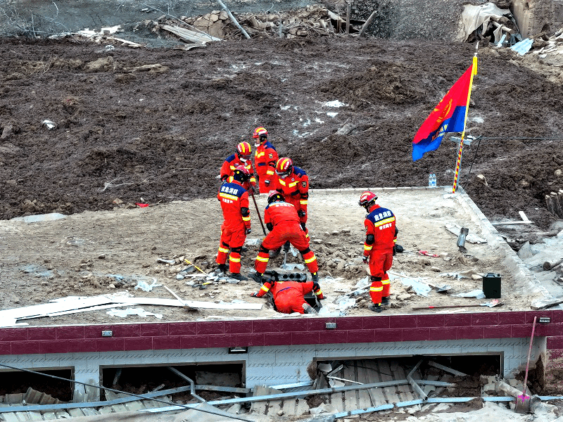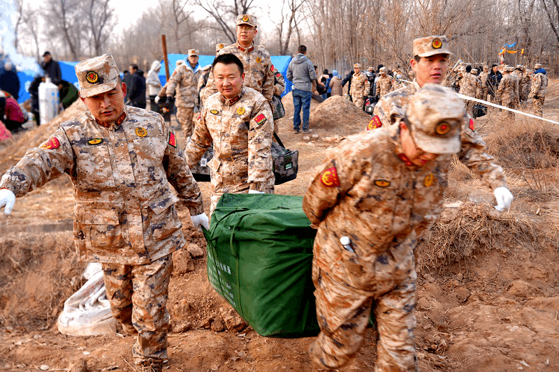 金田村,這個(gè)黃河邊不知名的小村子,今天吸引了眾多關(guān)注。一隊(duì)隊(duì)消防應(yīng)急救援人員和穿著軍大衣的民兵跑步進(jìn)出,或雙人抬擔(dān)架,或手拿肩扛救援物資。一處已被掩埋到只剩下房頂?shù)钠脚_(tái)上,傳出了救援人員的聲音:“從這‘下手’!”七、八個(gè)救援人員圍了過來,破拆器“咚咚”啟動(dòng)聲傳出來。他們所處位置的下方,剛剛探測(cè)出有被困人員。