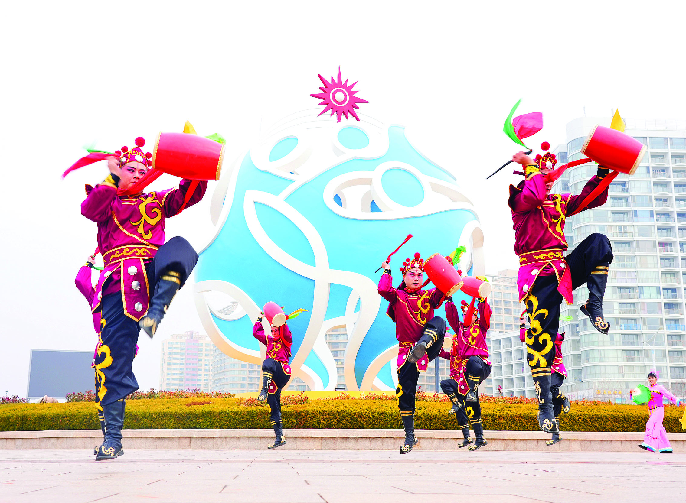 在煙臺海陽市鳳凰廣場,海陽市京劇團的演員們正在排練、展示海陽大秧歌。海陽大秧歌是一種集歌、舞、戲于一體的民間藝術(shù)形式,屬于山東三大秧歌之一。作為首批入選的國家級非物質(zhì)文化遺產(chǎn),先后參加了北京奧運會演出、上海世博會巡演、西安園藝博覽會巡演、塞爾維亞貝爾格萊德新春匯演等國內(nèi)外大型演出。