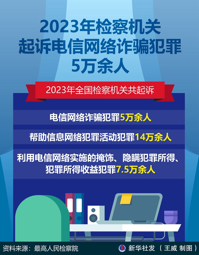 新華社北京3月3日電(記者邢拓)記者3日從最高人民檢察院獲悉,2023年全國檢察機關共起訴電信網(wǎng)絡詐騙犯罪5萬余人、幫助信息網(wǎng)絡犯罪活動犯罪14萬余人、利用電信網(wǎng)絡實施的掩飾、隱瞞犯罪所得、犯罪所得收益犯罪7.5萬余人。