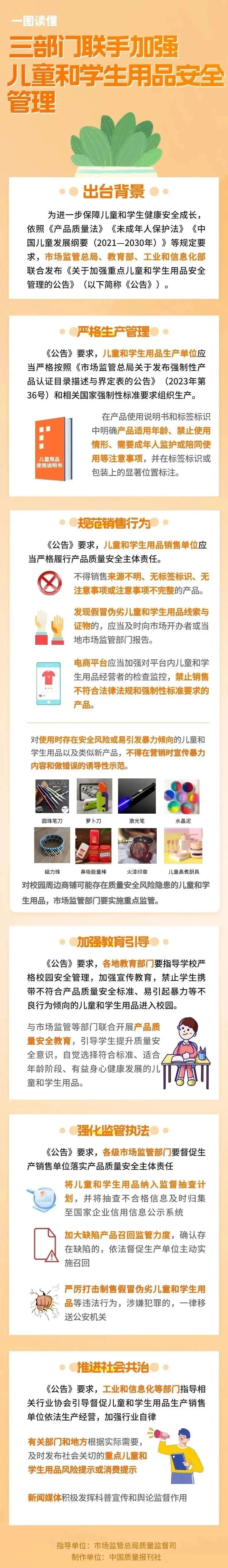為進(jìn)一步保障兒童和學(xué)生健康安全成長,依照《產(chǎn)品質(zhì)量法》《未成年人保護(hù)法》《中國兒童發(fā)展綱要(2021—2030年)》等規(guī)定要求,現(xiàn)就加強重點兒童和學(xué)生用品安全管理有關(guān)事項公告如下: