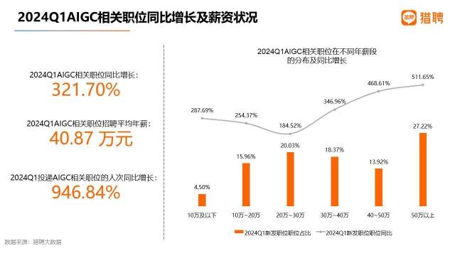 報告顯示,2024年一季度,AIGC(人工智能生成內(nèi)容)相關(guān)職位同比增長321.70%,呈現(xiàn)急劇增長態(tài)勢。同時,投遞該領(lǐng)域的人次水漲船高,同比增長946.84%。