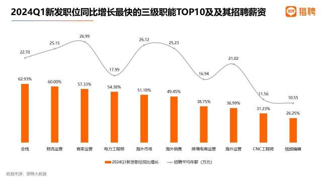 從一季度獵聘全平臺新發(fā)職位增長數(shù)據(jù)來看,全棧技術(shù)和物流運營成為增長最快的兩個三級職能,增長率高達60%及以上。在增長居前的TOP10職能中,與對外貿(mào)易相關(guān)的職能占據(jù)了四席,分別是海外市場、海外銷售、跨境電商運營和海外運營,同比增長率在36.99%至51.18%之間,位列第五至第八位。同時,視頻編輯職能以26.25%的增長率躋身至第十位。