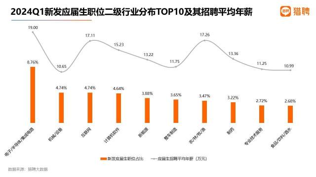 報告顯示,一季度新發(fā)應(yīng)屆生職位行業(yè)分布TOP10中,電子/半導(dǎo)體/集成電路排名第一,占比8.76%;機械/設(shè)備、互聯(lián)網(wǎng)以4.74%的占比并列第二;計算機軟件、新能源排名第四至第五。從這TOP10行業(yè)的應(yīng)屆生招聘平均年薪來看,電子/半導(dǎo)體/集成電路以19萬元領(lǐng)先。