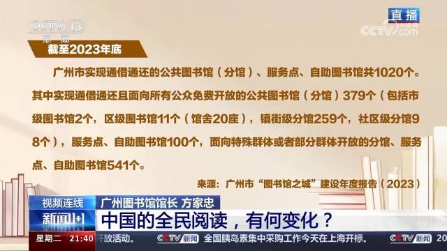 當前,我國國民閱讀的習(xí)慣還發(fā)生了哪些變化?在刷屏?xí)r代,作為曾經(jīng)國民閱讀的主陣地,公共圖書館是否仍具備圈粉的吸引力?《新聞1+1》本期連線廣州圖書館館長方家忠、中國圖書館學(xué)會副理事長程煥文,共同關(guān)注:中國的全民閱讀,有何變化?