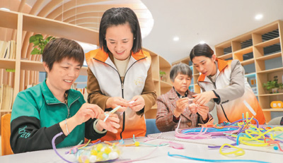 浙江省湖州市德清縣積極探索“醫(yī)養(yǎng)結(jié)合”“社區(qū)和居家養(yǎng)老”“機構(gòu)養(yǎng)老”等多種服務(wù)形式為依托的養(yǎng)老服務(wù)模式,讓老年人老有所養(yǎng)、老有所學(xué)、老有所依、老有所樂。圖為在德清縣康乾街道幸福鄰里中心,社工和老人一起做手工。王樹成攝(人民圖片)