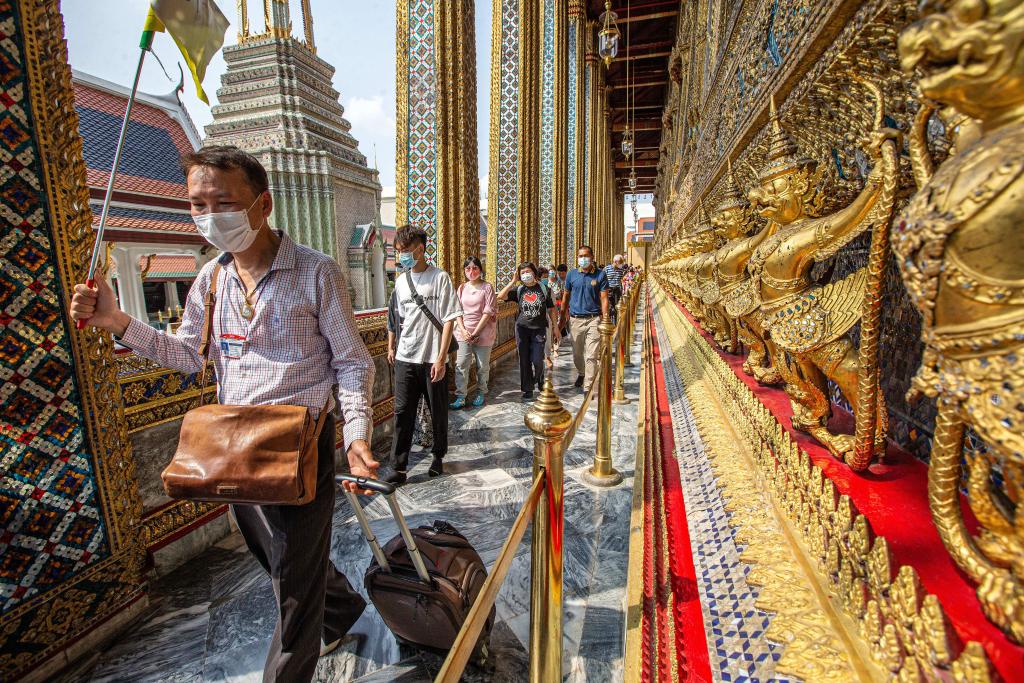 2023年2月7日,中國(guó)旅游團(tuán)游客在泰國(guó)曼谷大王宮景區(qū)游覽。新華社記者王騰攝