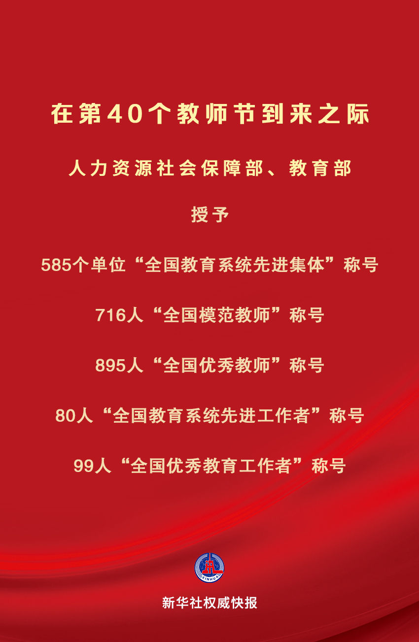 在中華人民共和國(guó)成立75周年和第40個(gè)教師節(jié)到來(lái)之際,為大力弘揚(yáng)教育家精神,營(yíng)造全社會(huì)尊師重教濃厚氛圍,激勵(lì)全國(guó)廣大教師和教育工作者落實(shí)立德樹(shù)人根本任務(wù),積極投身教育強(qiáng)國(guó)建設(shè),人力資源社會(huì)保障部、教育部決定授予中央財(cái)經(jīng)大學(xué)金融學(xué)院等585個(gè)單位“全國(guó)教育系統(tǒng)先進(jìn)集體”稱號(hào);授予刁榮春等716名同志“全國(guó)模范教師”稱號(hào);授予于淵等895名同志“全國(guó)優(yōu)秀教師”稱號(hào);授予王彥平等80名同志“全國(guó)教育系統(tǒng)先進(jìn)工作者”稱號(hào);授予王軍等99名同志“全國(guó)優(yōu)秀教育工作者”稱號(hào)。