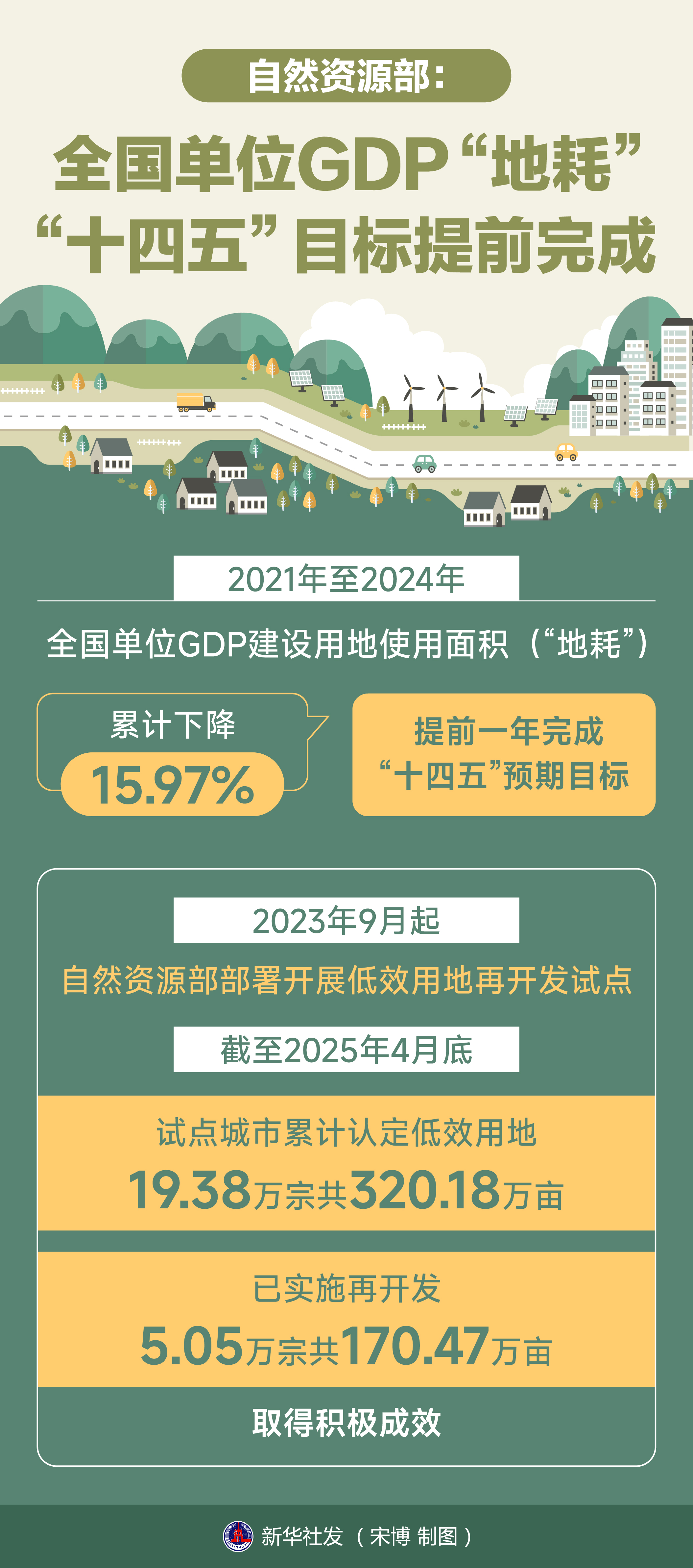 新華社武漢6月25日電(記者張陽)2021年至2024年,全國單位GDP建設(shè)用地使用面積(“地耗”)累計下降15.97%,提前一年完成“十四五”預(yù)期目標(biāo)。其中2021年至2024年,湖北省單位GDP“地耗”累計下降率為21.99%,為全國第一。