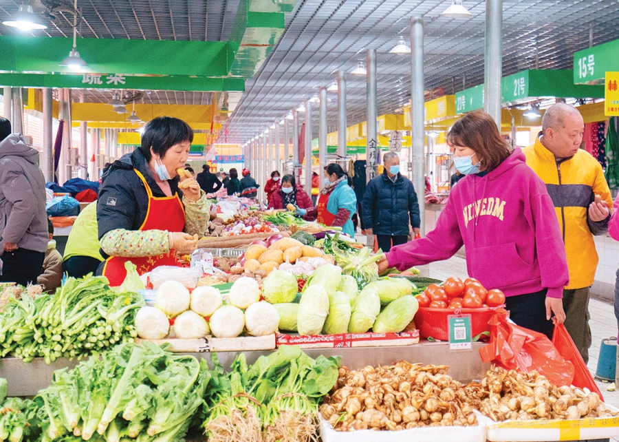 去年新開業(yè)的智慧農(nóng)貿(mào)市場迎來了首屆迎春花市。清香的茶葉、喜慶的春聯(lián)、香氣濃郁的芝士棒、趣味十足的小游戲……花市的年貨種類齊全,各個攤位縱橫交錯又秩序井然,市民們穿梭在不同的攤位前選商品、備年貨,臉上露出滿足的笑容。