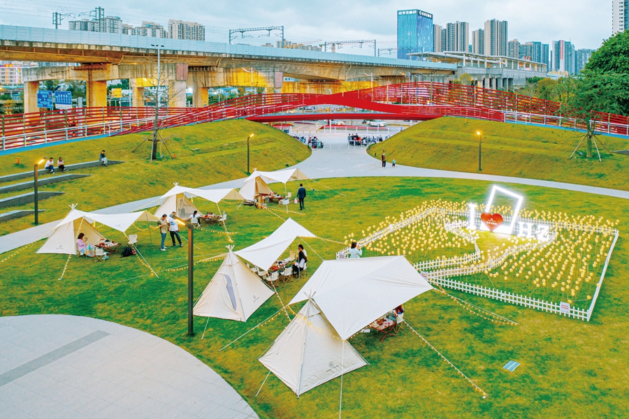 中星公園緊靠仲愷大道,莞惠城軌的列車不時在側(cè)經(jīng)過。市民們在中星公園設(shè)置的全民健身場地、飄帶浮橋、宇宙花海、兒童運動天地等場地游玩行走,享受全新的休閑體驗。草地上還整齊設(shè)置有帳篷,人們在此休憩聊天,體驗時下流行的圍爐煮茶。
