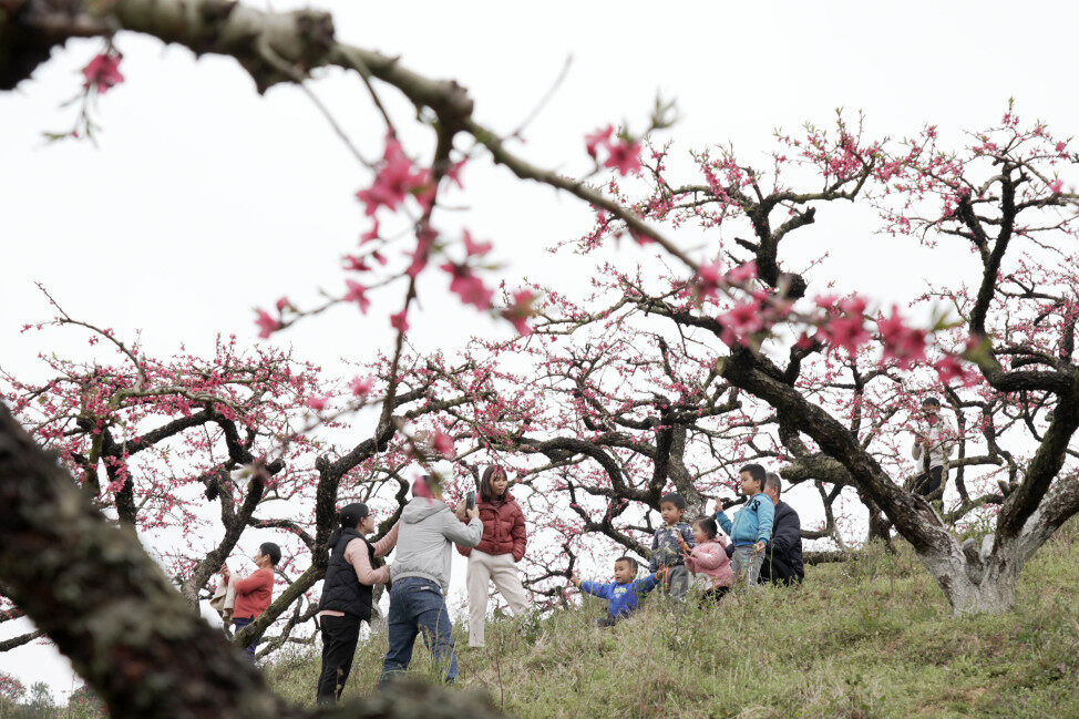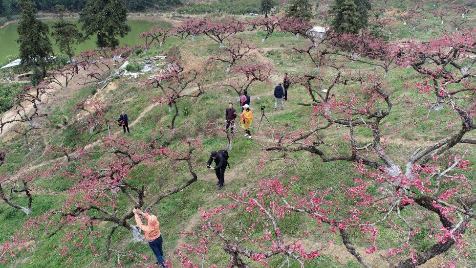 桃花盛開(kāi)吸引大批游客前來(lái)賞花。