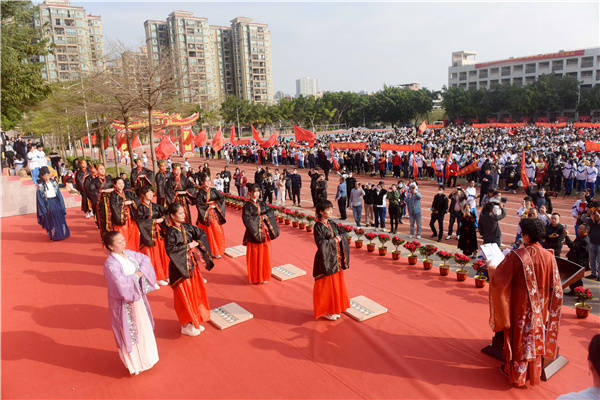 大會在莊嚴(yán)的國歌聲中拉開序幕。國旗映著旭日,冉冉升起,班旗隨著晨風(fēng),自由飛揚。行冠笄禮,手語表演、師生宣誓、戴成人徽章,跨成人門……精彩的舞獅催人奮進,鼓點敲打出拼搏的音符。冠笄之禮感謝父母養(yǎng)育之恩,感恩老師辛勤教誨。和著青春的凱歌,一中學(xué)子們跨過成人門、德勝門。