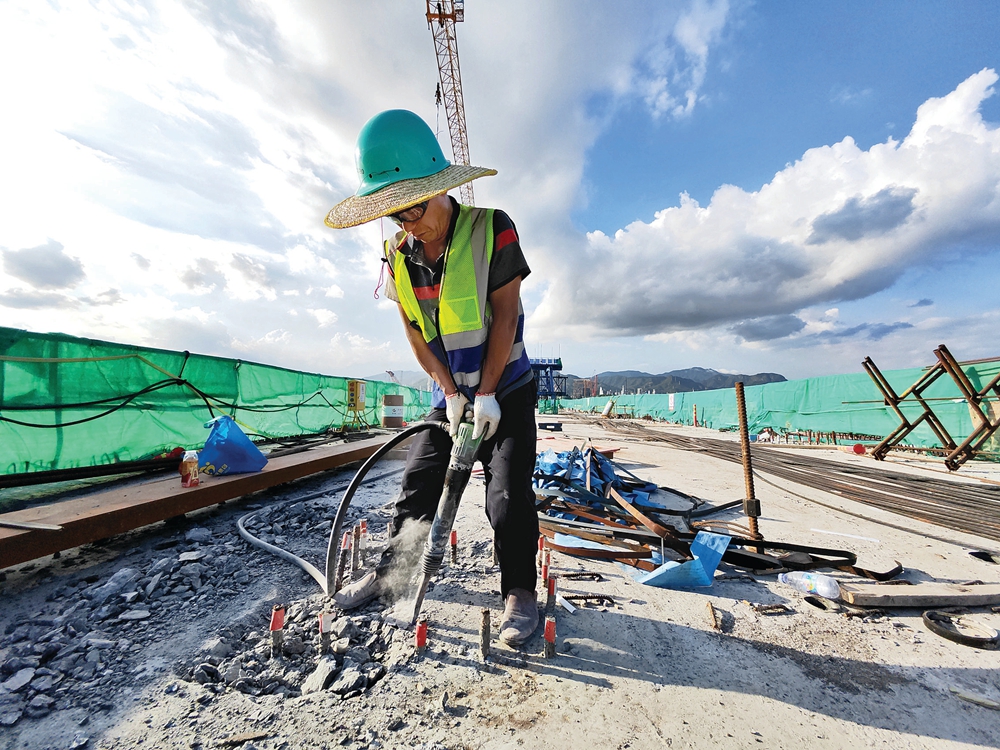 工人頭頂烈日、腳踩滾燙的水泥地面進行作業(yè)。