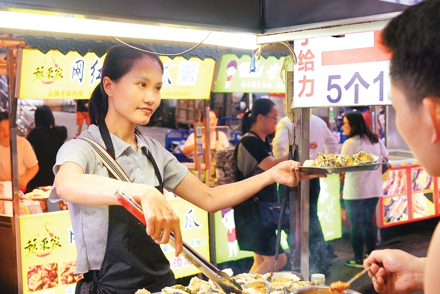 10年前,他們同在一個飯店打工,后來決定創(chuàng)業(yè),起初是“打游擊”擺攤,前幾年進入龍豐夜市“安心做生意”。因為烤出來的生蠔味道鮮美、價格親民,生意越來越好。如今他們還聘請了3個固定工、2個臨時工,自己當上了老板,“是龍豐夜市成就了我們!卑⑵既缡钦f。