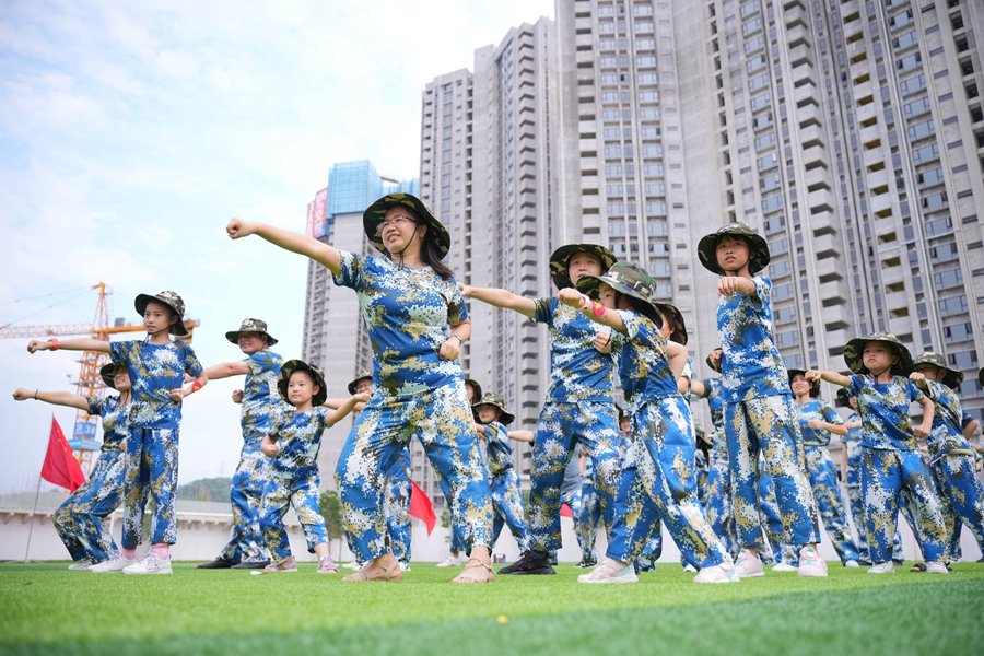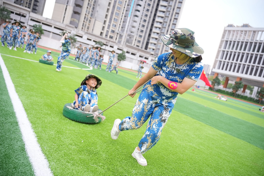 親子國防兵戎裝登場,家長斗志昂揚(yáng),孩子精神飽滿。據(jù)介紹,本次運(yùn)動(dòng)會(huì)以親子游樂為主,具體就是“大兵小兵齊上陣,軍事游戲大挑戰(zhàn)”。下午的操場上暖陽和煦,歡快的入場曲在空中回蕩,鮮艷的隊(duì)旗隨風(fēng)揚(yáng)起。在總教官帶領(lǐng)下,身著迷彩服的“大兵小兵”們操練起剛勁有力的大會(huì)操,每個(gè)人臉上都洋溢著陽光自信的微笑。