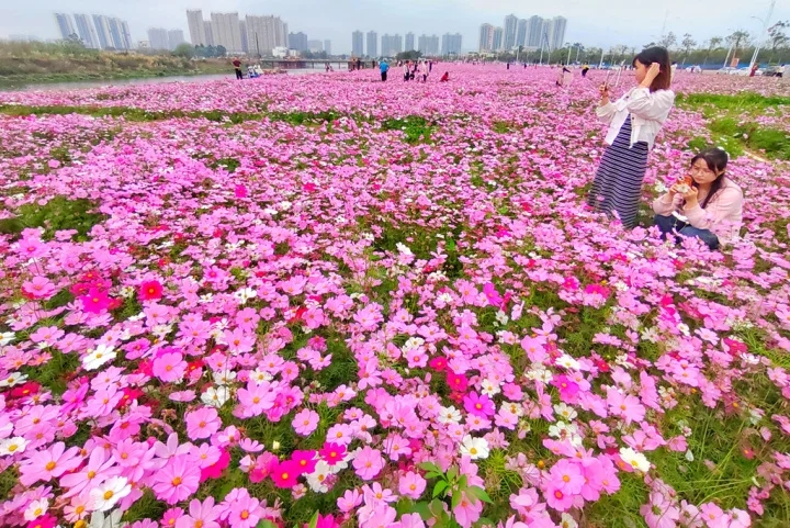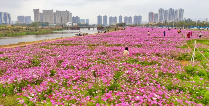 惠城區(qū)小金河大道路邊上有30畝格桑花盛開,吸引了許多游客觀賞打卡。