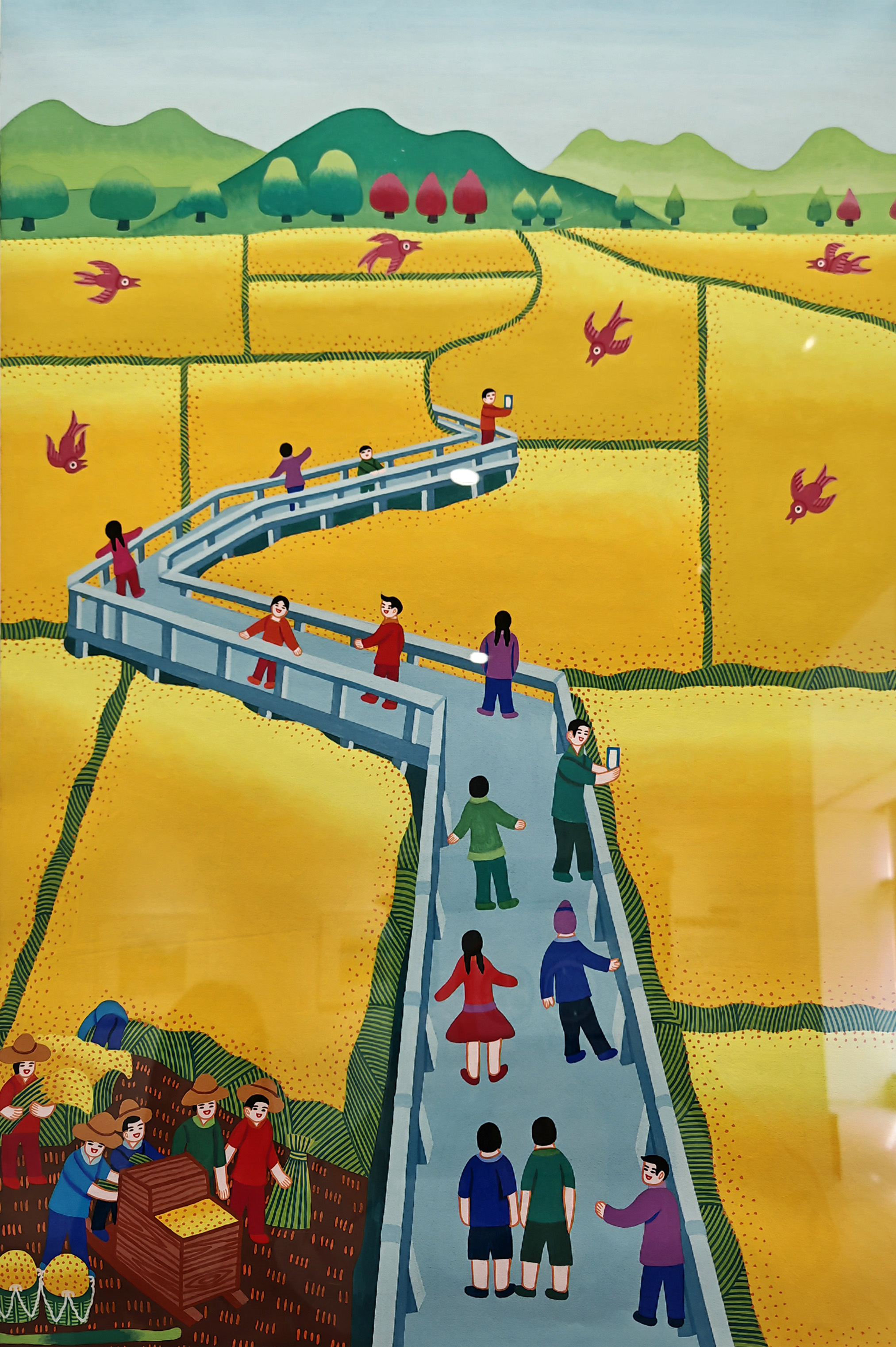 畫面里,金黃的田園廣袤如毯,蜿蜒的觀景步道串聯(lián)起詩(shī)意與煙火:游人們或漫步賞景、或定格美好,在田園風(fēng)光中盡享愜意;左下角的農(nóng)民們忙于豐收勞作,顆粒歸倉(cāng)的場(chǎng)景滿是農(nóng)耕的踏實(shí)與溫暖。
