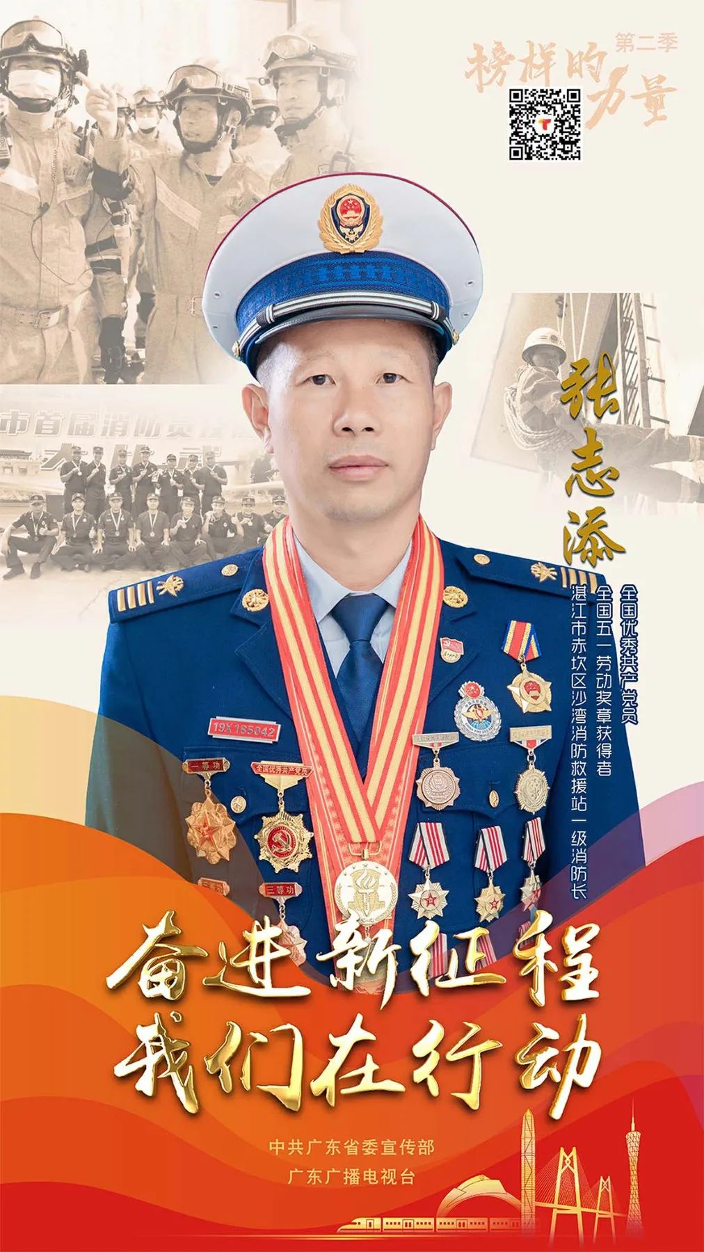 張志添,現(xiàn)任湛江市赤坎區(qū)沙灣消防救援站一級消防長,全國優(yōu)秀共產(chǎn)黨員,被譽為消防救援隊伍的“兵王”。25年來,先后參加4000余次急難險重任務(wù)處置,疏散搶救群眾1000余人。特別是2015年18級超強臺風(fēng)襲擊湛江,霞山區(qū)富多煤氣公司3個儲罐970余噸液化石油氣大面積泄漏,他在強臺風(fēng)中登罐堵漏,殊死搏斗40余小時,成功化解了災(zāi)難,以行動彰顯了一名共產(chǎn)黨員向死而生、逆火而行的使命擔(dān)當(dāng)。2021年7月、11月,先后兩次在北京人民大會堂被習(xí)近平總書記接見。