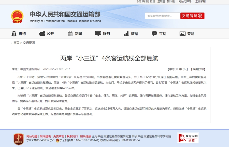 南方網(wǎng)訊 據(jù)交通運(yùn)輸部網(wǎng)站消息,2月19日10時(shí),搭載59名旅客的“吉順9號(hào)”從馬祖白沙啟航,出發(fā)前往連江黃岐客運(yùn)碼頭,并于當(dāng)日12時(shí)30分從連江返回馬祖,中斷三年的黃岐至馬祖“小三通”客運(yùn)航線恢復(fù)通航。至此,4條“小三通”客運(yùn)航線全部復(fù)航,為金門(mén)、馬祖鄉(xiāng)親往返兩岸提供了便利。自1月7日“小三通”客運(yùn)航線相繼復(fù)航以來(lái),已運(yùn)行62個(gè)往返航班、安全運(yùn)送旅客6715人次。