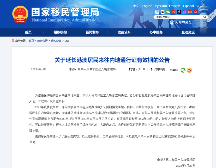 為依法保障港澳居民來往內地權益,中華人民共和國出入境管理局決定,自5月8日起延長港澳居民來往內地通行證(俗稱回鄉(xiāng)證)有效期,F(xiàn)公告如下: