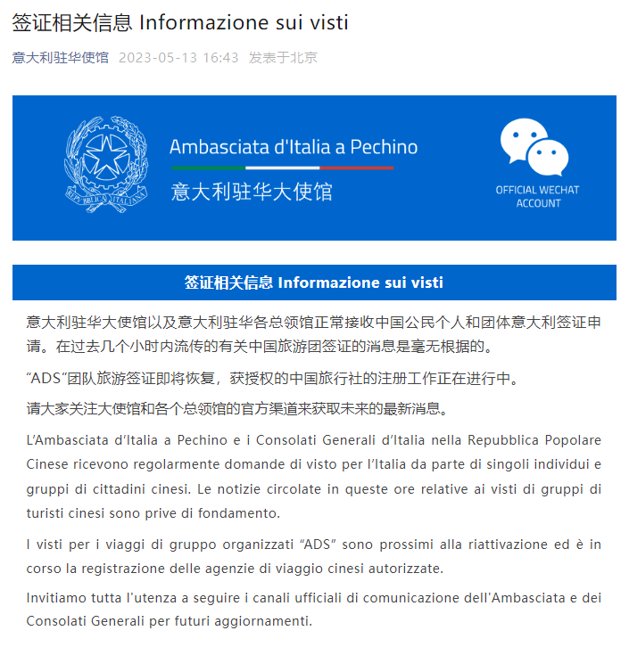 南方網(wǎng)訊 近期,有關(guān)“意大利簽證暫停辦理”的消息在社交網(wǎng)絡(luò)流傳!耙獯罄v華大使館”官方微信公眾號發(fā)布消息稱,意大利駐華大使館以及意大利駐華各總領(lǐng)館正常接收中國公民個人和團(tuán)體意大利簽證申請。在過去幾個小時內(nèi)流傳的有關(guān)中國旅游團(tuán)簽證的消息是毫無根據(jù)的。