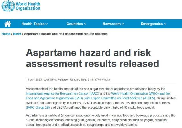 據(jù)世衛(wèi)組織官網(wǎng)14日消息,國際癌癥研究機(jī)構(gòu)(IARC)、世界衛(wèi)生組織(WHO)和糧食及農(nóng)業(yè)組織食品添加劑聯(lián)合專家委員會(JECFA)今天發(fā)布了阿斯巴甜對健康影響的評估結(jié)果。