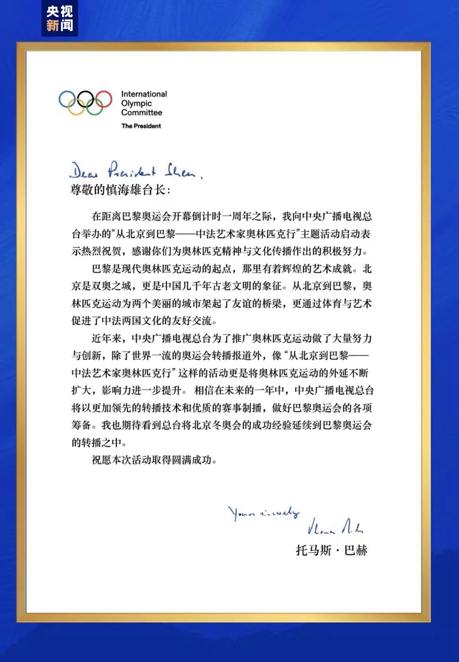 國際奧委會主席巴赫在賀信中表示,中央廣播電視總臺為了推廣奧林匹克運動做了大量努力與創(chuàng)新,除了世界一流的奧運會轉播報道外,像“從北京到巴黎——中法藝術家奧林匹克行”這樣的活動更是將奧林匹克運動的外延不斷擴大,影響力進一步提升。相信在未來的一年中,中央廣播電視總臺將以更加領先的轉播技術和優(yōu)質的賽事制播,做好巴黎奧運會的各項籌備,期待看到總臺將北京冬奧會的成功經驗延續(xù)到巴黎奧運會的轉播之中。