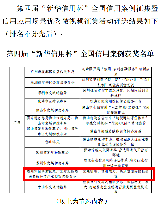 惠州日報訊 (記者林麗娟 魏怡蘭 通訊員黃翠婷)1月4日,第四屆“新華信用杯”全國信用案例暨信用應用場景優(yōu)秀微視頻評選結(jié)果在中國城市信用建設高峰論壇上正式公布,在全國563個參選信用案例中,遴選出150個優(yōu)秀信用案例。其中,惠南科技園“黨建引領,信用助力,高質(zhì)量服務園區(qū)企業(yè)”信用案例被評為優(yōu)秀案例。